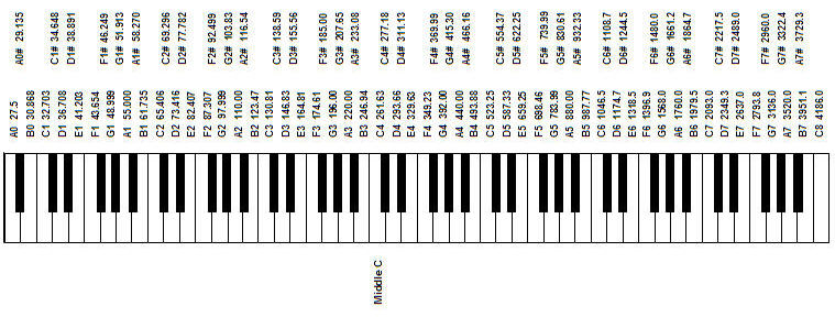 Also, I used a standard numerical keyboard to create my sounds in reference to the A4=440 Hz key. So a piano goes from 1-89, with middle C being key “40.” Here’s a picture of all the frequencies on a keyboard.